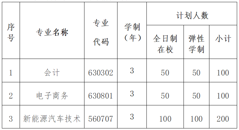 第十一条 2019年学校设置高职扩招招生专业3个,总计划400人,具体分专业计划等情况详见下表。
