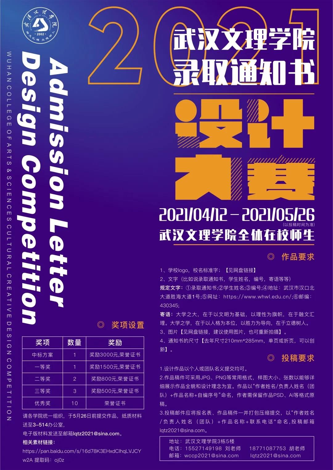 录取通知书,不仅仅是入学的一份通行证,更是饱含学校对学生的期待与期望,方寸之间满是情怀。时值建党百年,新气象、新征程、新希望,为进一步传递学校的办学理念和精神风貌,丰富校园文化,增强同学们对学校的认同感、归属感和使命感,现面向全校师生公开征集我校2021级录取通知书设计方案,从校训、校景、校园生活等撷取创意的灵感,将文化、创新、生活有机结合,激发广大学生爱校荣校情怀,进一步调动广大学子积极性、自觉性参与校园文化建设。