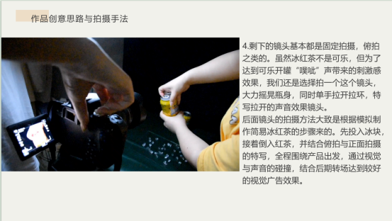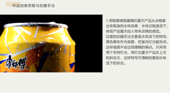 该作品拍摄主题选择的是冰红茶。视频整体是酷炫风格,参考学习了电视上常见的饮料广告拍摄手法,抓住了“冰”这个特点,起到了产品卖点的宣传作用。全程围绕产品出发,通过视觉与声音的碰撞,结合后期转场达到较好的视觉广告效果。