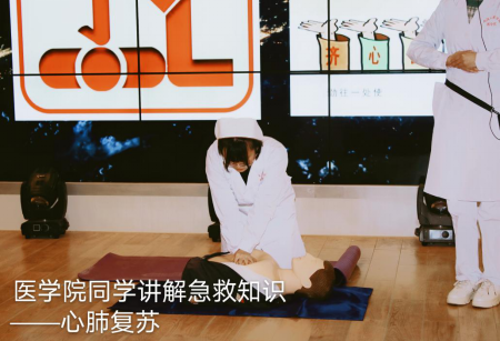 培训会第二项,18级护理实验班孙娟和18级护理一班李玉娥为现场做了“医学急救”---心脏复苏的培训。两位分享人现场讲解了心脏复苏适用的场合、情景、技术要领并现场用人形模具进行了具体心脏复苏全过程的演示和教学。这个环节的展示联系实际,生动具象,深深吸引了每一位同学的注意力。