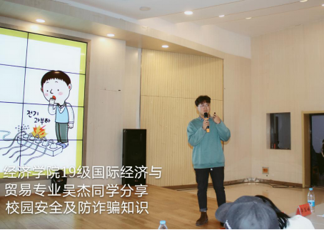 培训会第三项,经济学院分团委学生部部长吴杰结合经济学院《学生安全文明公约》以及学校关于防电信网络诈骗的通知精神详解了寝室文明、卫生、学生安全以及防骗方面的知识,他夹叙夹议,恰到好处引用生活中的案例,全面而不枯燥。