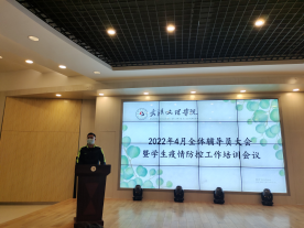 刘超副处长对与会辅导员开展了学生疫情防控工作培训要求辅导员精准研判疫情防控形势,耐心对学生进行详细防疫政策解读,做到人性化、柔性化管理;加强对学生的关怀,增加和学生的有效沟通渠道,统筹落实疫情期间的毕业生就业等相关工作;建议各学院定期召开学生座谈会,及时反馈和解决学生在疫情严防严控阶段所面临的问题。