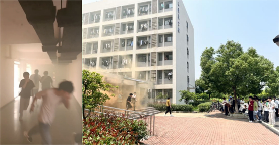 随着警报声响起,学校立即启动“宿舍火灾”紧急逃生预案,一边发出紧急救援疏散命令,一边向上级部门汇报情况。“火情”所在的宿舍单元楼内全体学生在老师们的指引和帮助下迅速有序地撤离到安全区域,保卫处工作人员拉起警戒线防止其他同学误入“火灾现场”,整个演练过程快速、安全、有序,达到了预期目标。