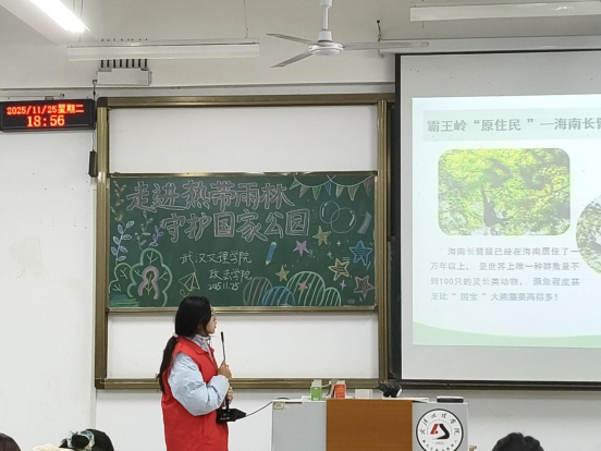聆听雨林密语,从长臂猿的啼鸣到蝴蝶的振翅。随着志愿者的宣讲,同学们也仿佛步入雨林,进入了一个立体的生命王国。在她们的口中,最空灵的乐章是“雨林歌王”——海南长臂猿 的啼鸣,最震撼的美景是遮天蔽日的板根植物、巨大的藤本和“绞杀现象”,这是无数自然生物共同栖息的美丽家园。这里的一呼一吸,一鸣一叫,都是雨林诉说的古老密语。