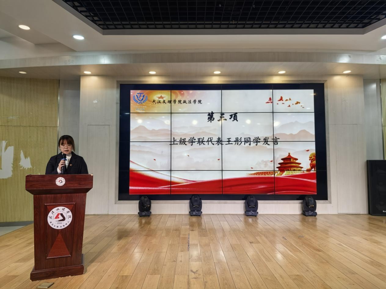 大会第三项,上级学联代表王彤同学发言。她回顾了过去一年政法学院学生会在校园文化建设、社会实践、志愿服务等方面的亮眼成绩,肯定其主动结合专业特色、积极配合学校工作的担当精神,赞扬其恪守服务宗旨、倾听学生心声的工作态度。她鼓励政法学院学生会坚守初心、勇于创新、直面挑战,希望全体青年学子勤学强本领、实干践使命,不负时代与青春。
