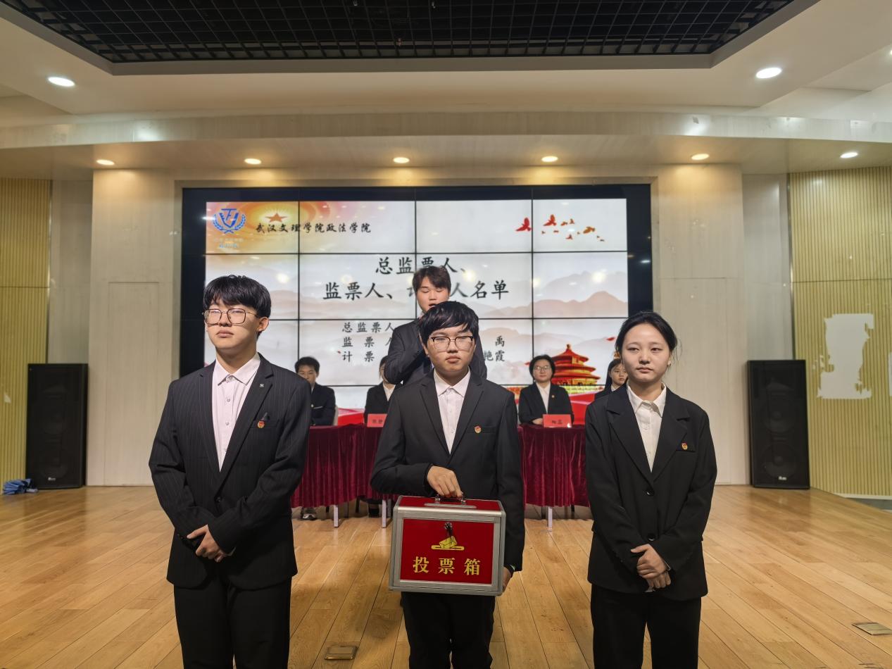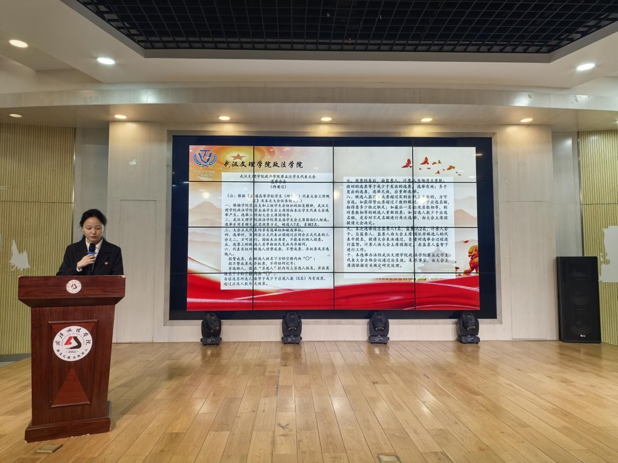大会第八项,经大会全体代表投票表决后,由政法学院分团委书记张晓冬上台宣读政法学院第五届学生会委员名单:阳蕊、张福应、张静怡。张晓冬老师对新任委员表示诚挚祝贺,并对新一届主席团提出三点要求:一要坚守服务初心,做同学们信得过的贴心人;二要精诚团结协作,共同推进学生工作再上新台阶;三要发挥表率作用,在学习和工作中争当模范,他表示学生会委员应在学院党组织领导和分团委指导下,锐意进取、开拓创新,为学院发展贡献青春力量,共同推动学生工作的开展。