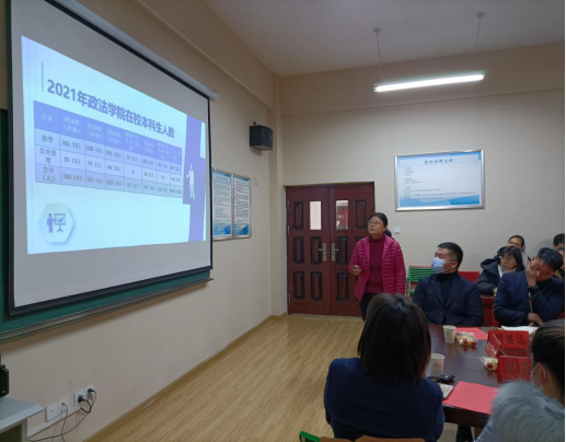 政法学院参会人员包括:政法学院常务副院长李蔚副教授、教学副院长陈海峰副教授、行政副院长曾鹏老师、法学系主任张卫容副教授、副主任罗平副教授、思政课部主任曹卓副教授、副主任潘红霞博士、公共管理系主任马君副教授和七名教师代表。