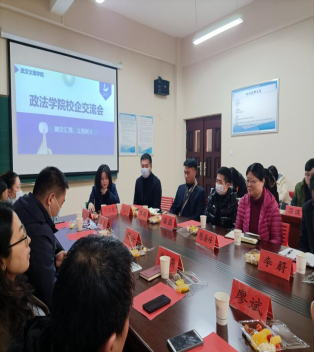 为了进一步加强学校和社会企业单位的合作,保持教学与社会实践的结合,发挥学校和企业的各自优势,实行产教融合,实现校企双方共赢,为地方经济建设培养适应社会需求的应用型人才,政法学院校企交流会于2021年12月29日在5栋415法学基础实验室举行。本次校企交流会诚邀了来自省内十余家同行企业共襄盛会,与会人员围绕“校企合作,产教双赢”这一主题,检阅校企合作的相关成果,交流教学与实践、就业一体化融合的路径,展示学院和企业的各自风采,探索校企合作建设的新方向,以促进新时代民办高校产教水平不断提升,为我院校企合作由传统形式转向新型模式嬗变升级而建言献策。