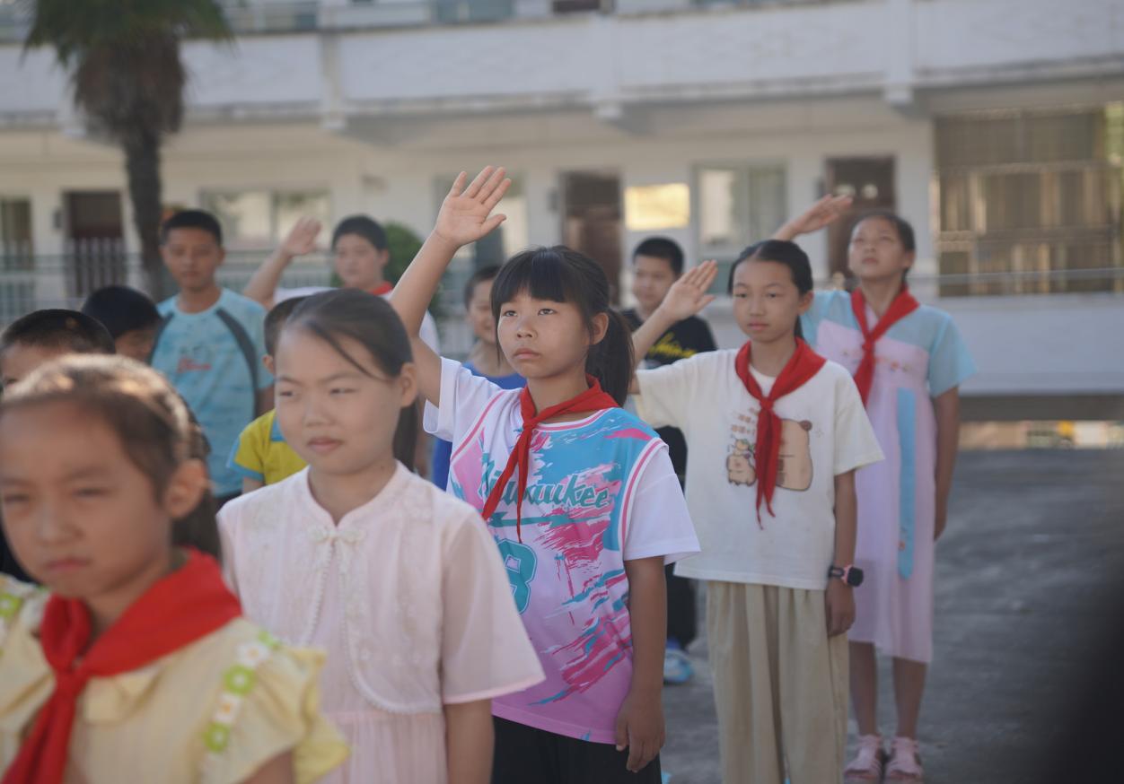 当日早上,志愿服务队与桂花完全小学全体师生肃立于操场,举行升国旗仪式。当雄壮的《义勇军进行曲》响彻校园,五星红旗冉冉升起,全体人员神情肃穆、目光如炬,向国旗行注目礼,以最崇高的敬意致敬祖国山河,告慰先烈忠魂。仪式后,志愿者以详实史料与生动讲解,为师生们重现七七事变的悲壮历程,深刻阐释抗战精神的时代内涵。字字铿锵的讲述中,那段浴血奋战的历史如画卷徐徐展开,激发起师生们强烈的爱国情怀与责任担当。