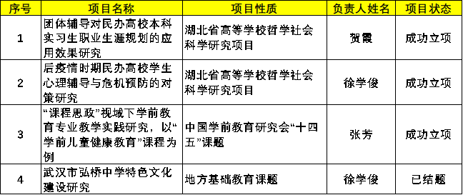 教育学院共有两项科学研究项目获批指导性项目立项:分别是副院长贺霞副教授申报的《团体辅导对民办高校本科实习生职业生涯规划的应用效果研究》项目、心理学学科带头人徐学俊教授申报的《后疫情时期民办高校学生心理辅导与危机预防的对策研究》项目。