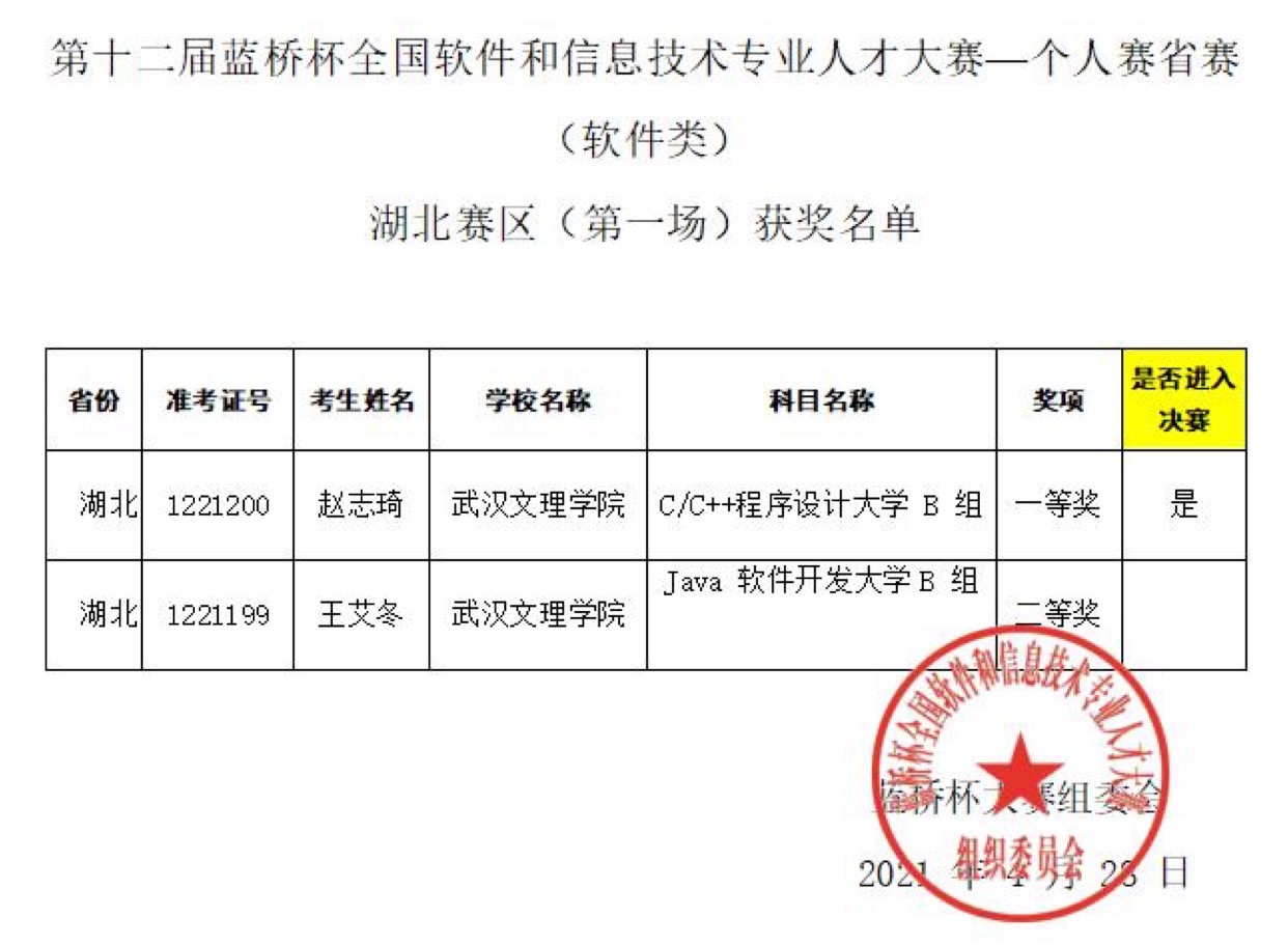 近日,从第十二届“蓝桥杯”全国软件和信息技术专业人才大赛组委会(省赛)传来喜讯。学子喜获湖北赛区一等奖3项、二等奖3项、三等奖2项。其中3人取得国赛参赛资格。