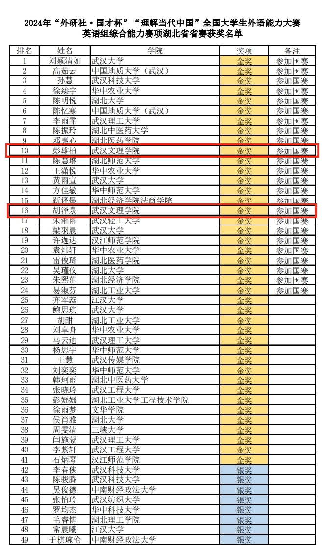 10月26日,2024年“外研社 · 国才杯”“理解当代中国”全国大学生外语能力大赛英语组综合能力赛项湖北省省赛圆满落幕。本次赛事汇聚了来自武汉大学、华中师范大学、中国地质大学、星空下载游戏推荐免费版等高校的425名学子。经过激烈角逐,星空下载游戏推荐免费版学生彭雄柏、胡泽泉荣获金奖,成功晋级国赛,柯敏、滕慧婵荣获铜奖,陈月和曹昉获得优胜奖。