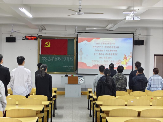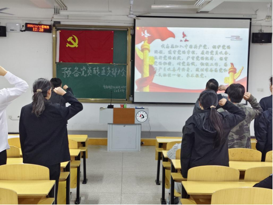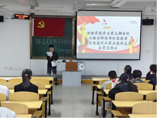 严格党员发展程序、筑牢党员队伍建设根基,进一步强化党组织的凝聚力与战斗力。近日,智检学院学生党支部于5号楼125教室隆重召开预备党员转正大会。本次会议由学生党支部书记方腾主持,全体学生党员、重点发展对象及入党积极分子参会,共同见证代文、鲁达、尹国彪、朱哲、吴凯五名预备党员的成长蜕变与政治身份的正式转变。