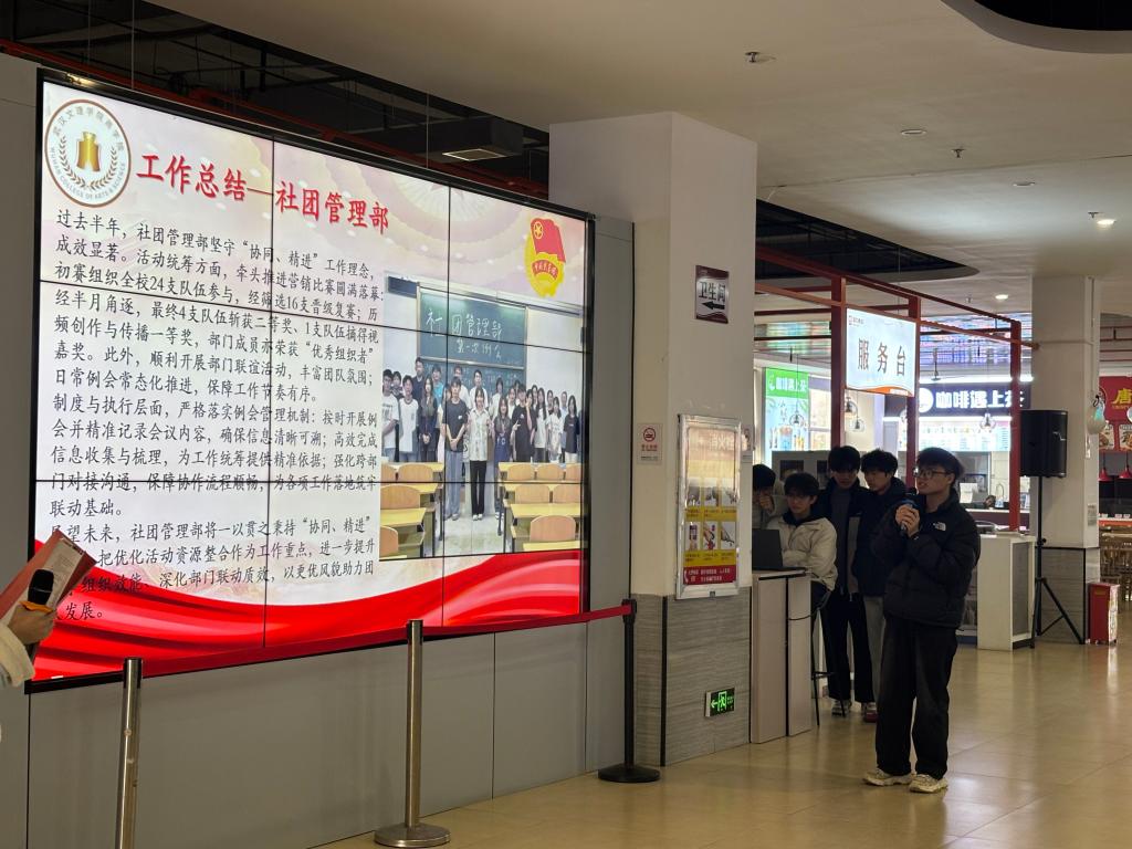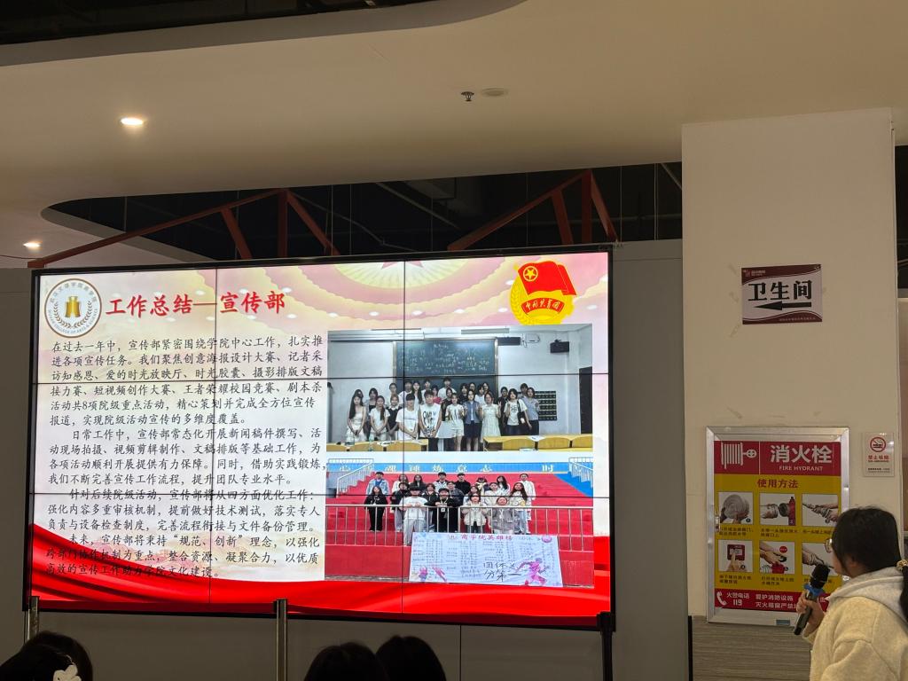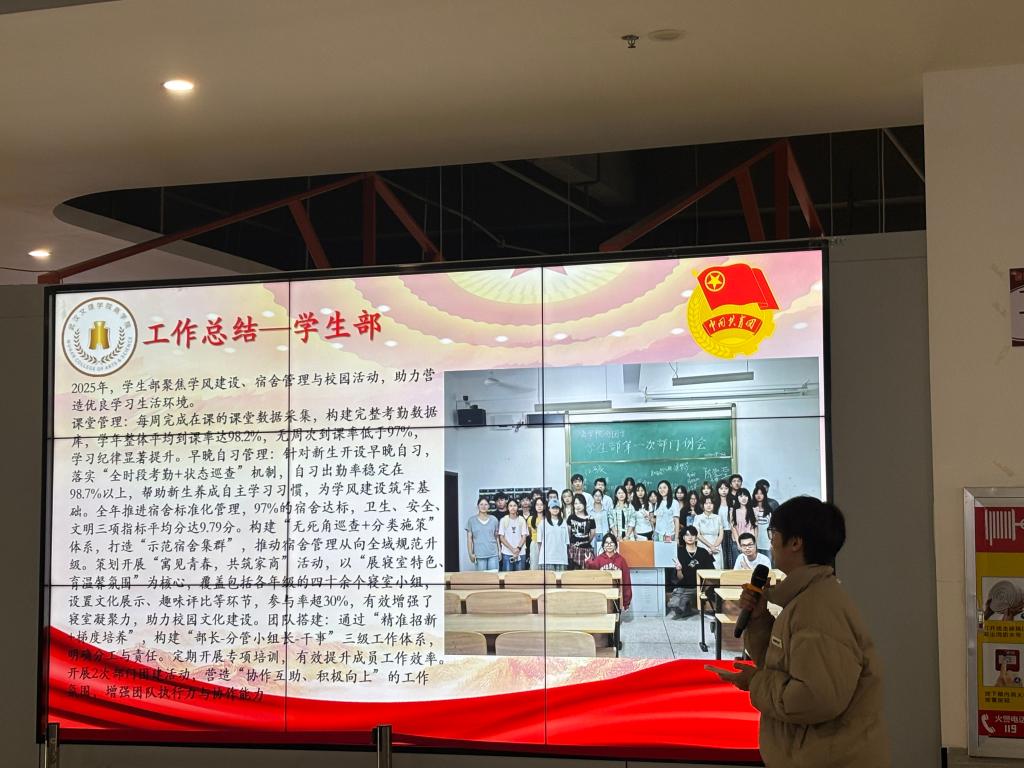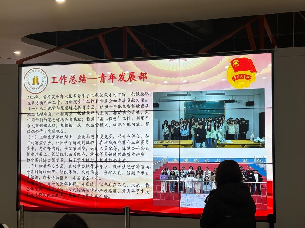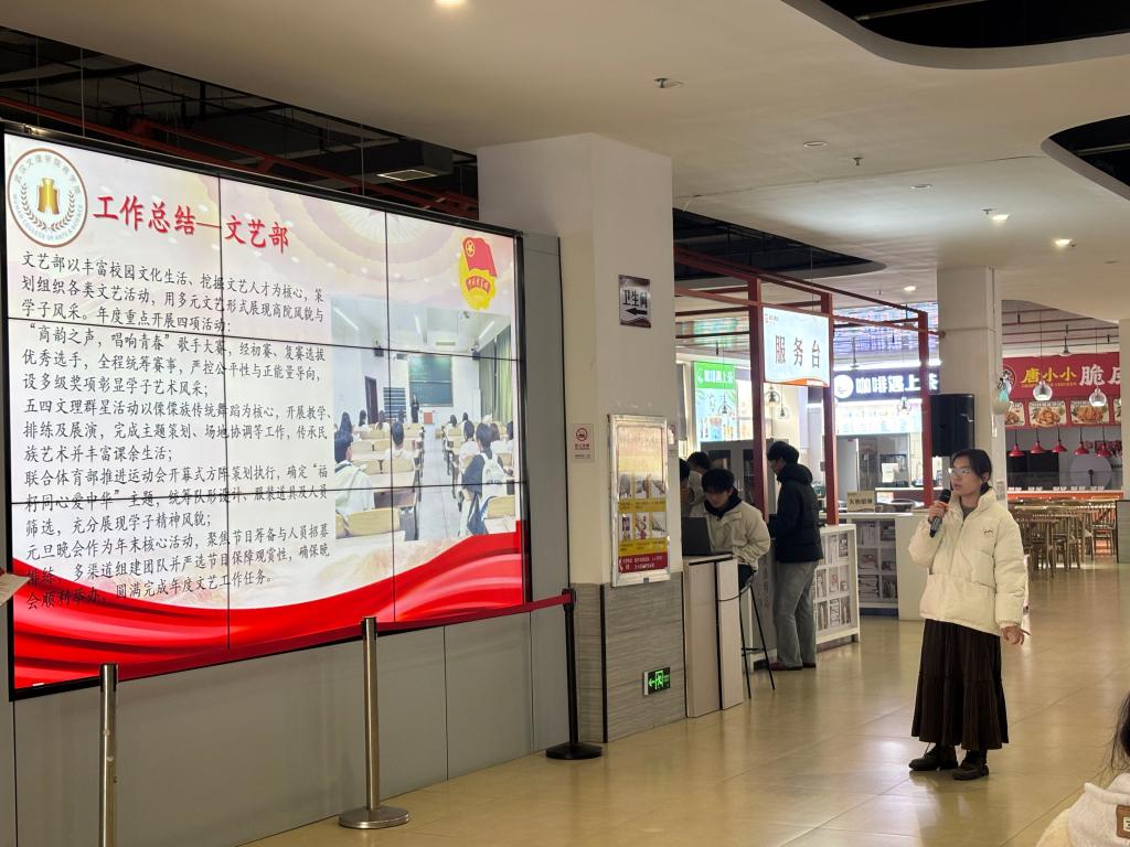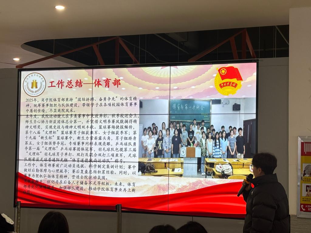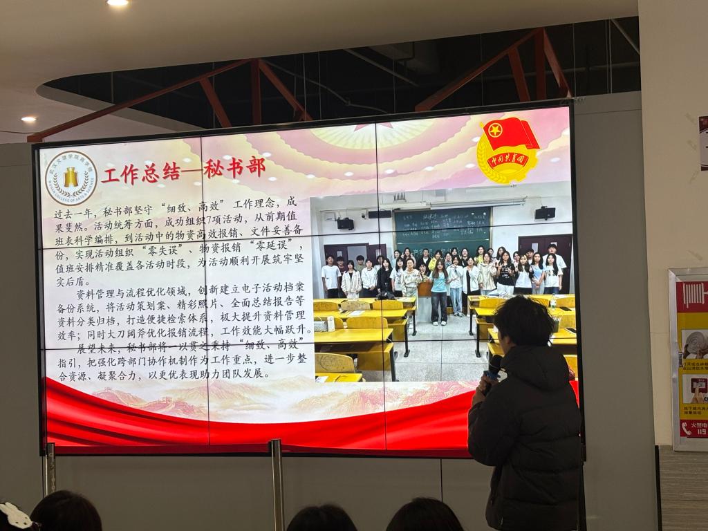 在述职汇报环节,各部门依次进行年度总结。组织部深耕团务工作,强化思想引领;志愿者工作部成果丰硕,计划拓展合作渠道;秘书部总结后勤保障“零失误”,优化台账提升效率;宣传部梳理多元宣传成果,拟创新宣传形式;文艺部复盘文艺活动,尽显学子艺术风采;体育部回顾赛事组织,提出强化队伍建设;青年发展部围绕“第二课堂”,强调深化与专业融合;学生部立足学风与权益服务,表态提升服务质量;社团管理部总结社团工作,明确推进规范化发展。