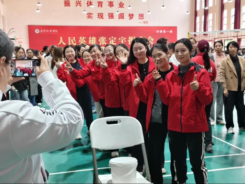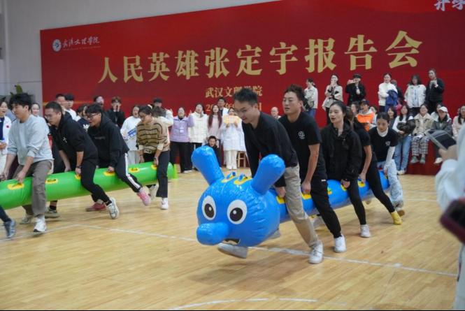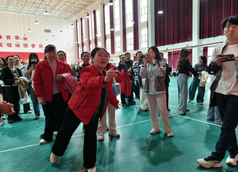 “摸石头过河”赛道上,老师们踩着“石头”交替前进,双脚不能触碰地面。稍有不慎便会“落水”,引得围观学生阵阵欢笑。政法学院的老师们步伐稳健,双手迅速传递垫脚石,动作一气呵成,赢得热烈掌声。赛场边加油声此起彼伏,平日严谨的教师们此刻全情投入,脸上洋溢着青春与拼搏的光芒,展现出别样的育人风采。