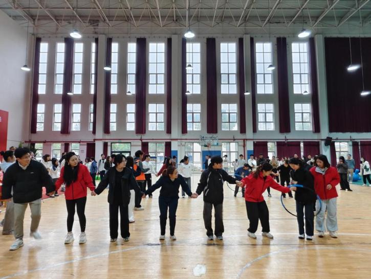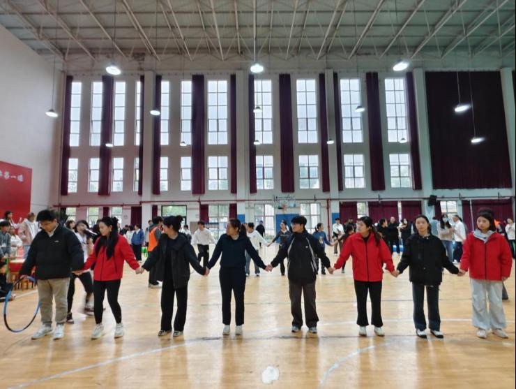 “穿越呼啦圈”项目则是对团队配合的极致考验。八名老师手拉手站成一排,需在不松手的前提下,让呼啦圈从队首传到队尾。平日里握惯粉笔的手紧紧相扣,弯腰、转身、钻圈,动作连贯又充满趣味。有老师为了快速传递,像“小松鼠”般灵活地穿过呼啦圈,政法学院的老师们配合默契,呼啦圈如流水般迅速传递至队尾,展现出团队协作的灵动与高效。那一刻,讲台上的沉稳与赛场上的活力完美交融,诠释着教育者多元的魅力。